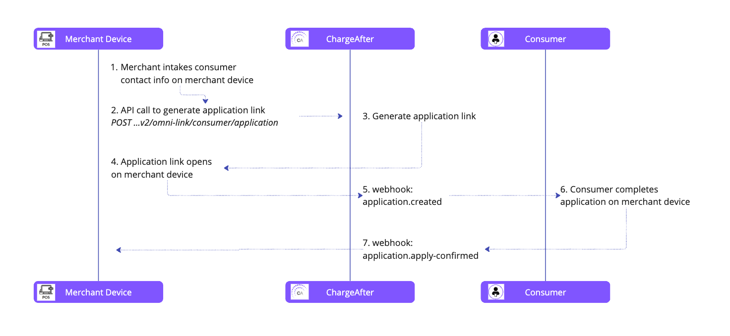 The consumer undergoes the financing application process through a device provided by the merchant. In this flow, no link is sent to the consumer.