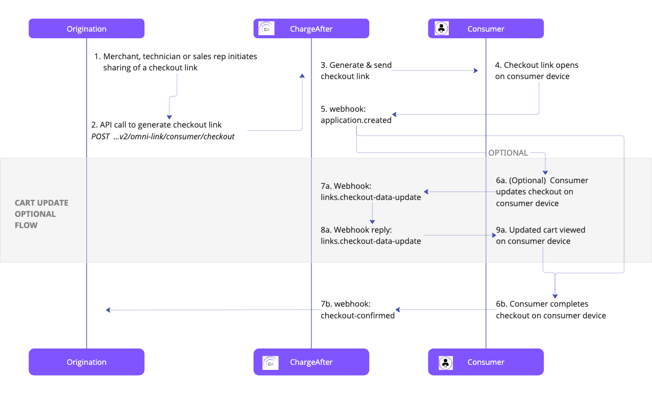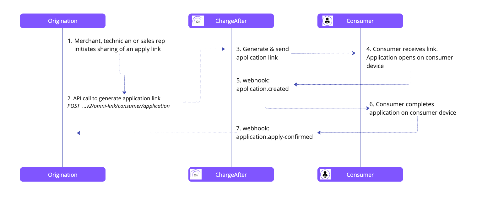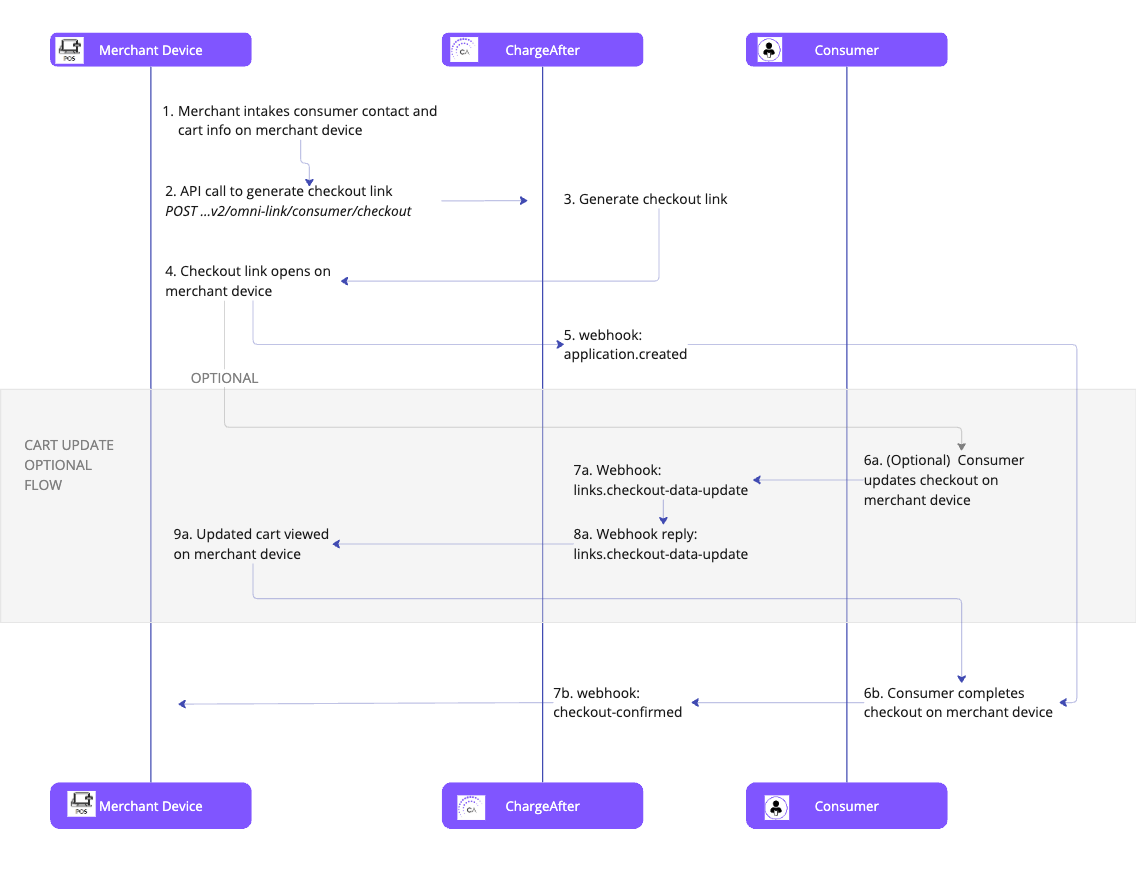 Custom integrations are possible using ChargeAfter's Omni-Link API. The Omni-Link API calls are used to send a link for the consumer to start an application or checkout and to retrieve link data for the consumer-associated context. The link can be sent via email or SMS to either the consumer or merchant device. For tips on how to use the Omni-Link API calls, see here .